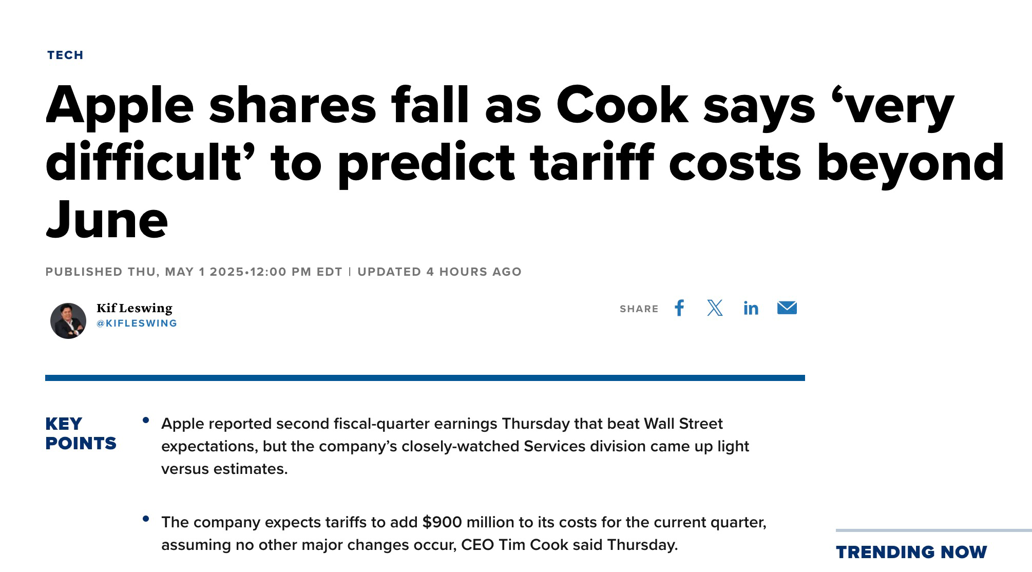 库克在电话会议上表示,假设没有新的关税或其他重大变化,苹果预计关税将使本季度成本增加9亿美元。不过,他补充说,6月之后的情况“非常难以预测”“因为我不确定关税会发生什么变化”。
